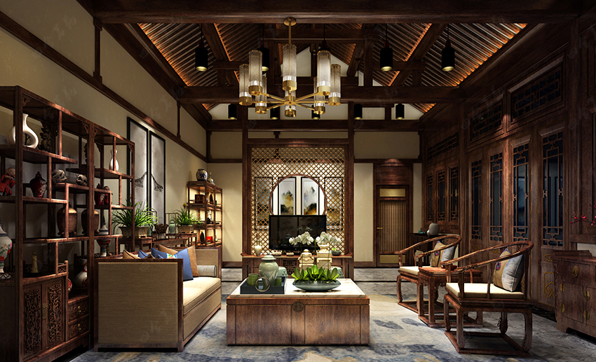 設(shè)計(jì)在空間布局上強(qiáng)調(diào)中式古典與現(xiàn)代的融合,根據(jù)室內(nèi)外不同生活場景,增加空間的時光流動感。在仿古中增加現(xiàn)代的生活氣息,通過對比產(chǎn)生碰撞,再用設(shè)計(jì)師圓融的修飾筆觸將“矛盾”調(diào)和,以此手法研磨出巧妙的時代諧和感,讓空間氛圍顯得別具一格且富有文化氣息。